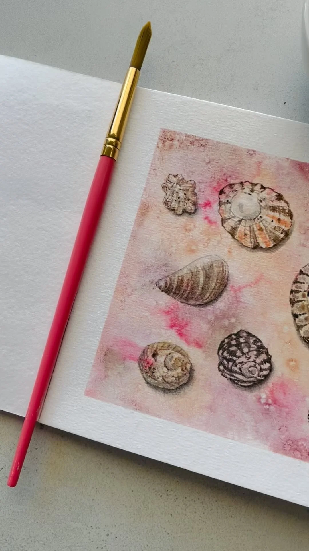 A woman painting a pink flower on paper in an art studio. The desk is decorated with watercolor paintings of shells, a crab, starfish, and insects, along with framed and unframed artwork of plants and ocean scenes, and jars of seashells and rocks.